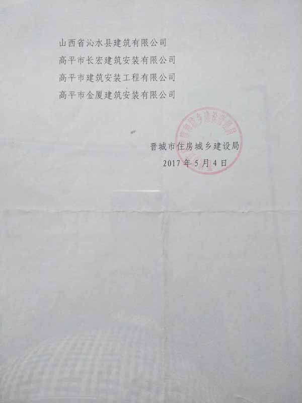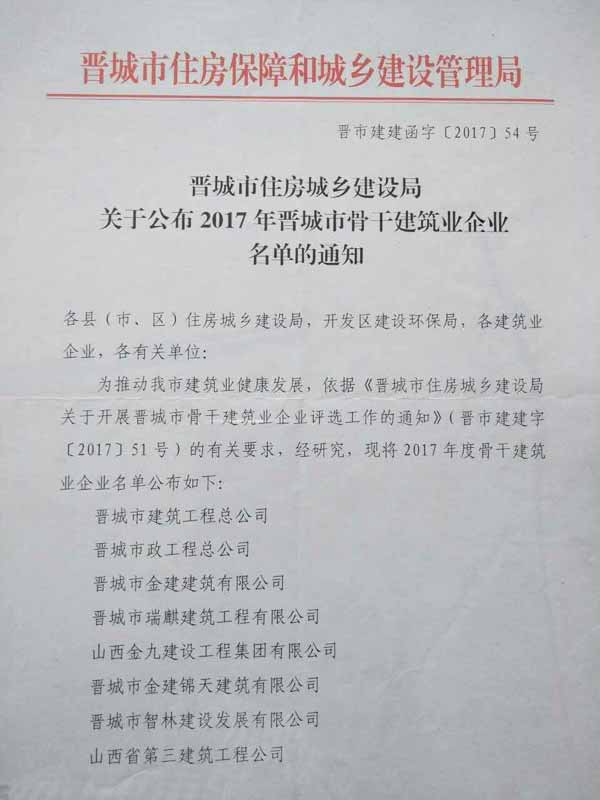 2017年5月4日,接晉城市住房城鄉(xiāng)建設(shè)局有關(guān)通知,晉城市金建建筑有限公司入選2017年晉城市骨干建筑業(yè)企業(yè)名單。2017年晉城市骨干建筑業(yè)企業(yè)自公布之日起,“骨干建筑業(yè)企業(yè)”稱(chēng)號(hào)有效期一年。今后,每年評(píng)選一次,每年****季度評(píng)選完成,“骨干建筑業(yè)企業(yè)”稱(chēng)號(hào)有效期一年。